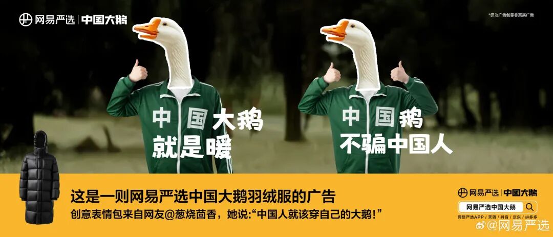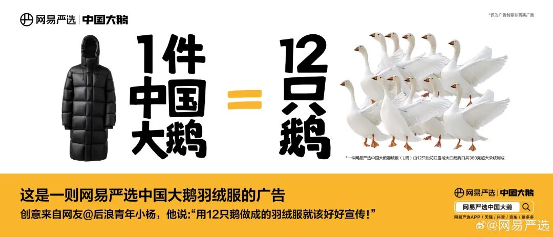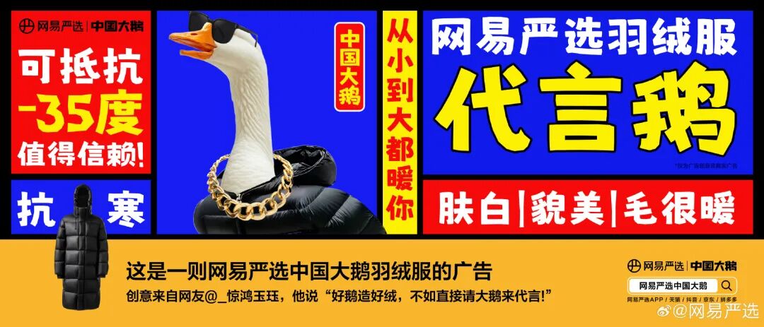 网易严选主打一个听劝,火速聘请了12只松花江雪域大白鹅成为网易严选羽绒服的代言人,并把网友的神回复做成了野生海报。