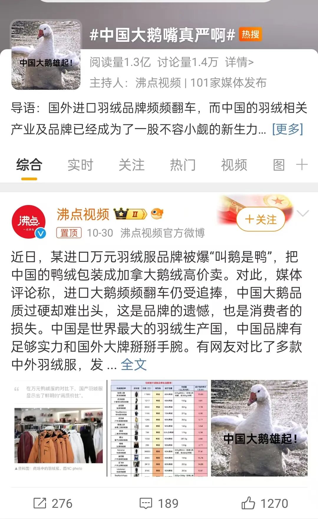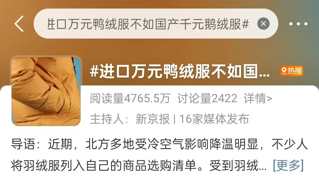 随着天气转凉,又到了买羽绒服的季节,前几天,#进口万元鸭绒服不如国产千元鹅绒服#话题引发网友热议。
