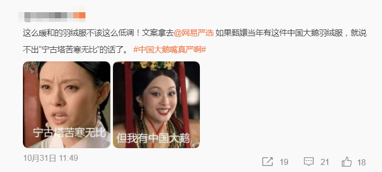 文案从多方面突出中国大鹅的暖和用料实在。致敬椰树风、比肩“多喝热水”语录,甚至还搬出了甄嬛传热梗。太会玩了,好美的精神状态。