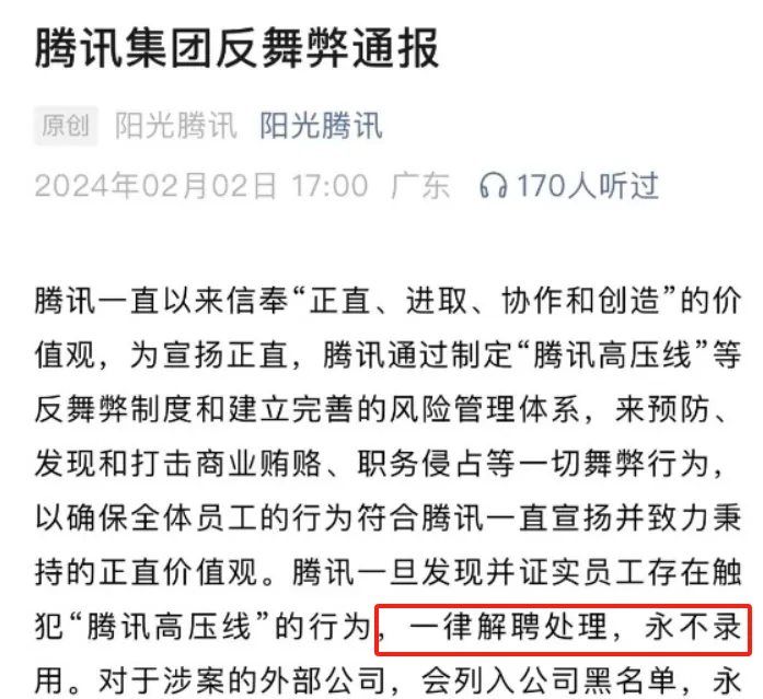 今年2月份,腾讯就曾发布反舞弊通报,称2023全年,腾讯反舞弊调查部门查处了逾70起触犯“腾讯高压线”的案件,涉及120多名员工被解聘。其中,近20人因涉嫌犯罪被移送公安机关处理。