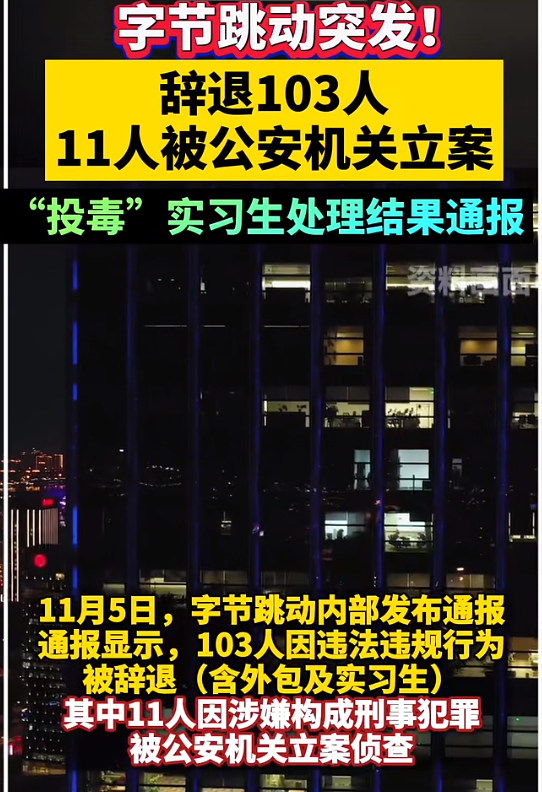 昨天(11月5日),字节跳动发布内部通报称,共103人因违法违规行为被辞退(含外包及实习生),其中11人因涉嫌构成刑事犯罪,被公安机关立案侦查。