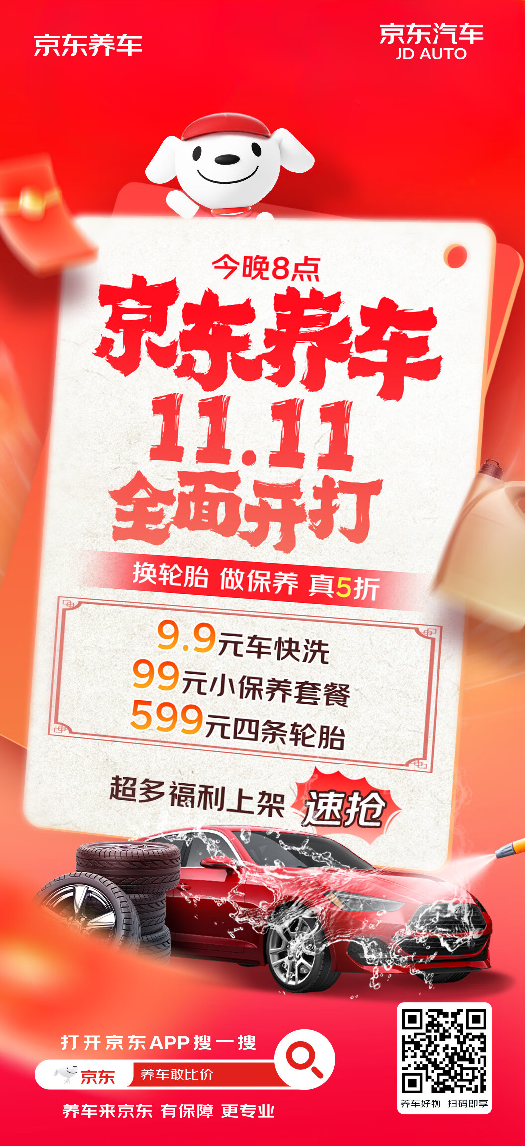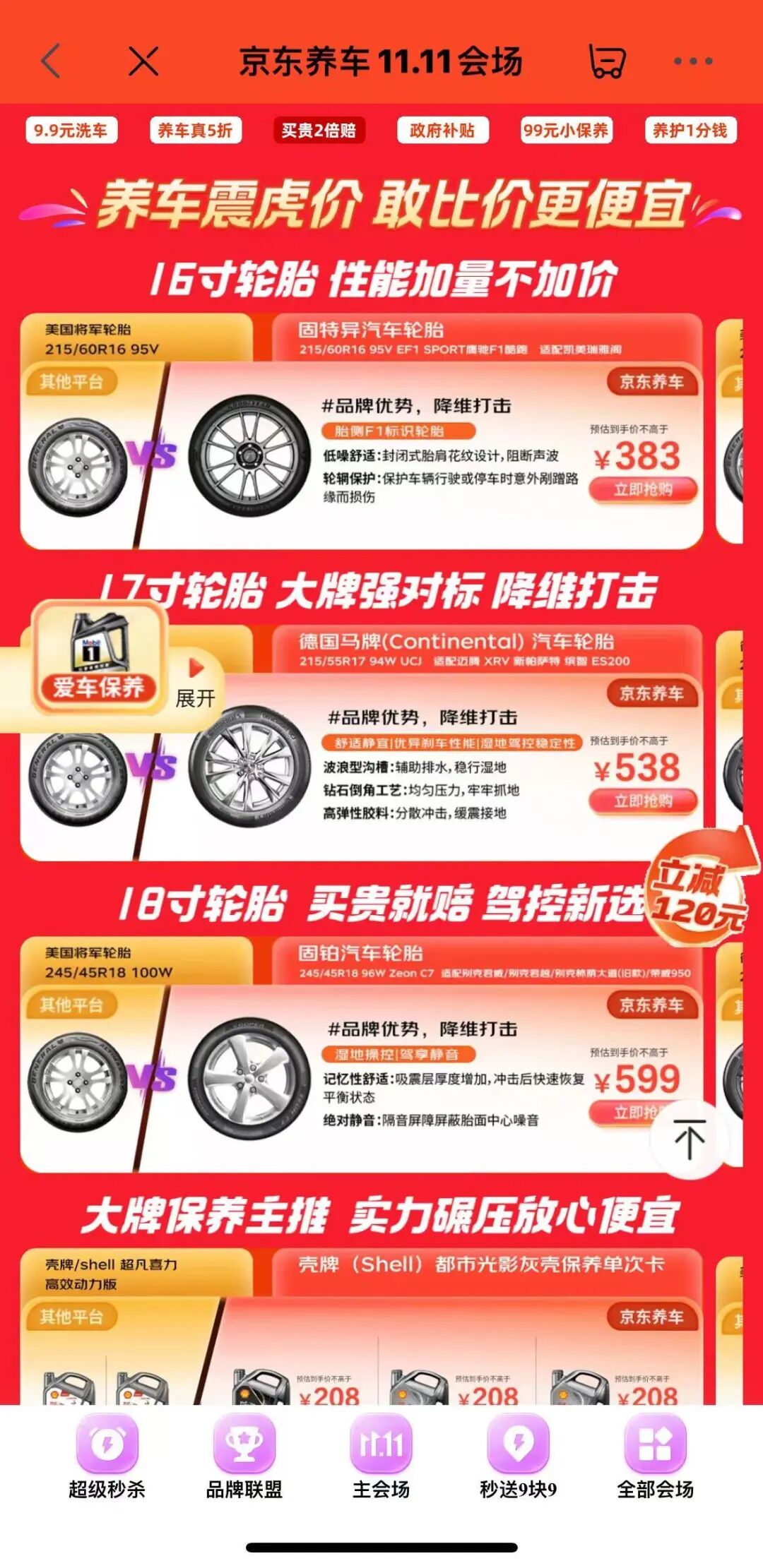 除了前文提到的保养、换胎、洗车等优惠机制,还有低至1分钱的养护品限时抢购活动,享受政府补贴的轮胎以旧换新政策等,米其林、德国马牌、朝阳、韩泰等国际知名轮胎品牌,京保养、美孚、壳牌、博世等机油大牌都参与到了京东11.11大促中。