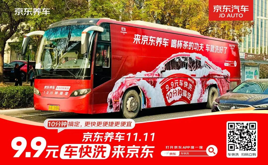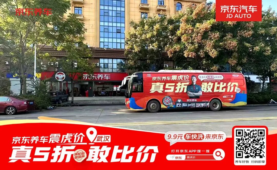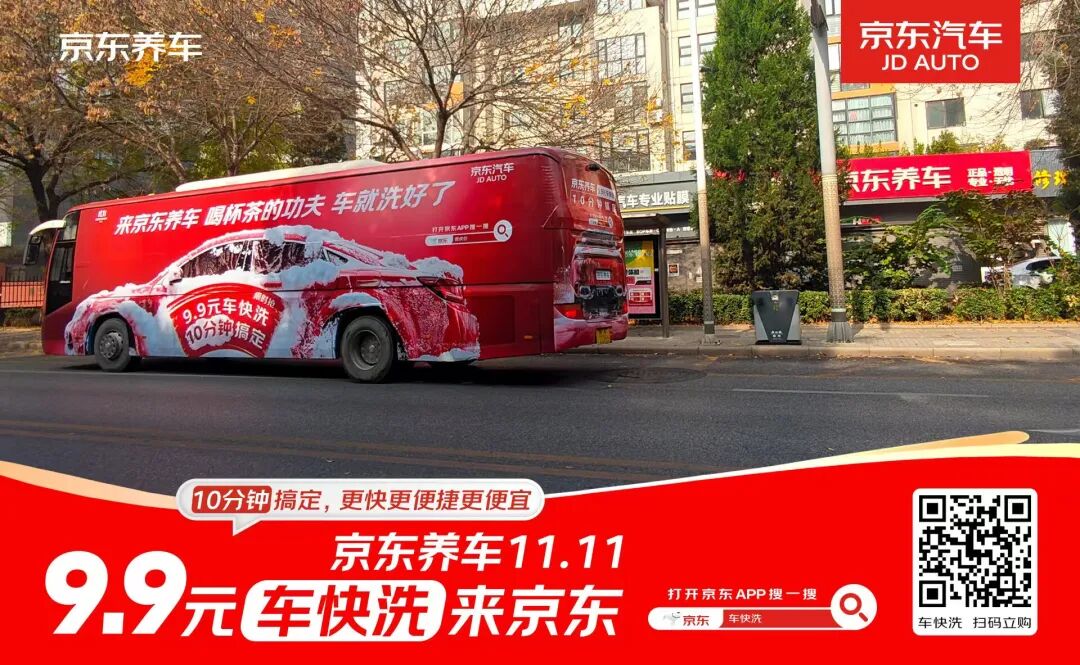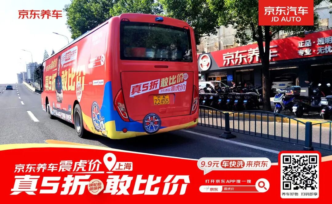 配合线上的营销造势,京东养车在北京、上海、广州、武汉等全国十座城市大规模投放了巴士广告、电梯广告等线下媒介,传达在保养、换胎、洗车等场景的“低价”心智。