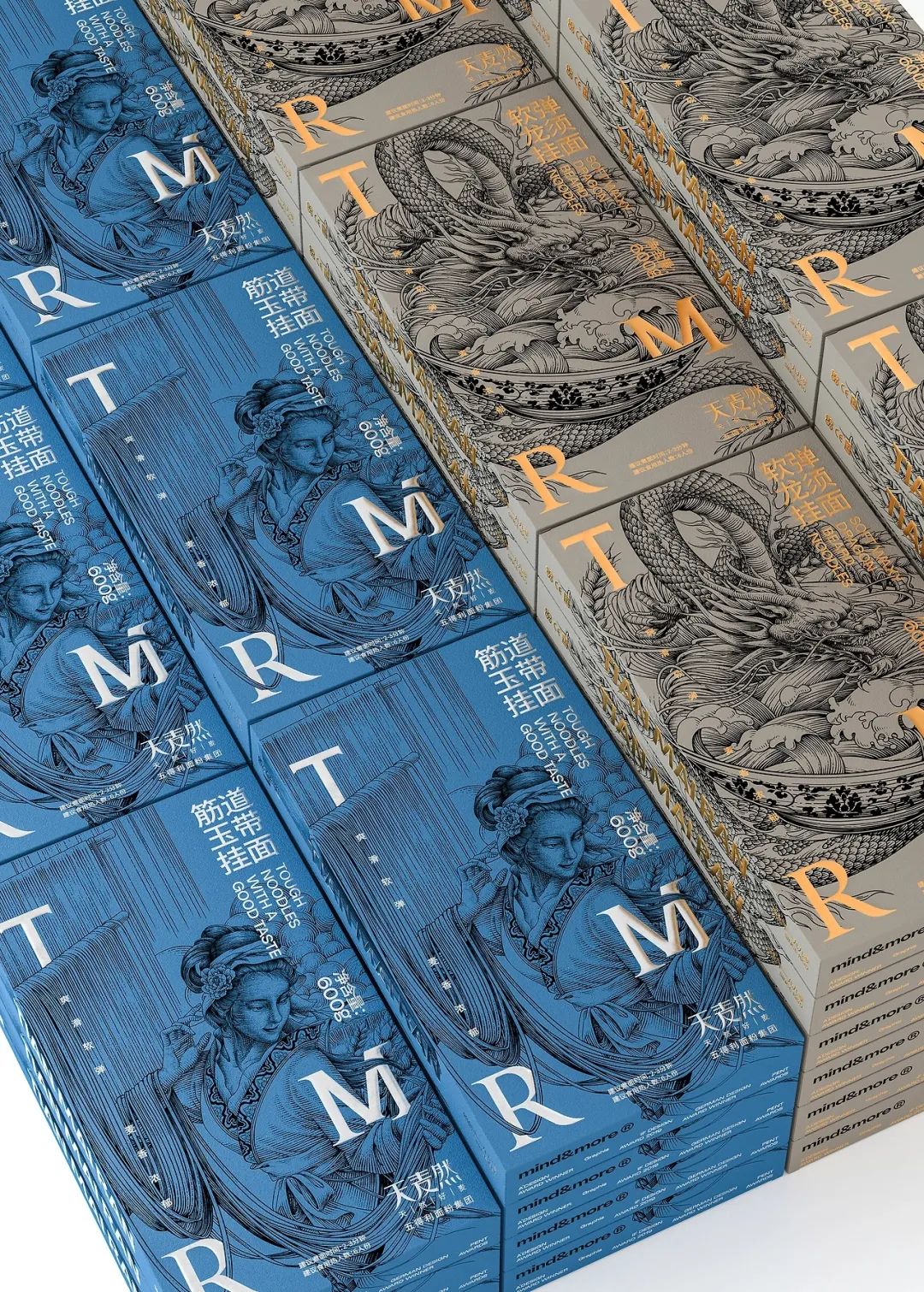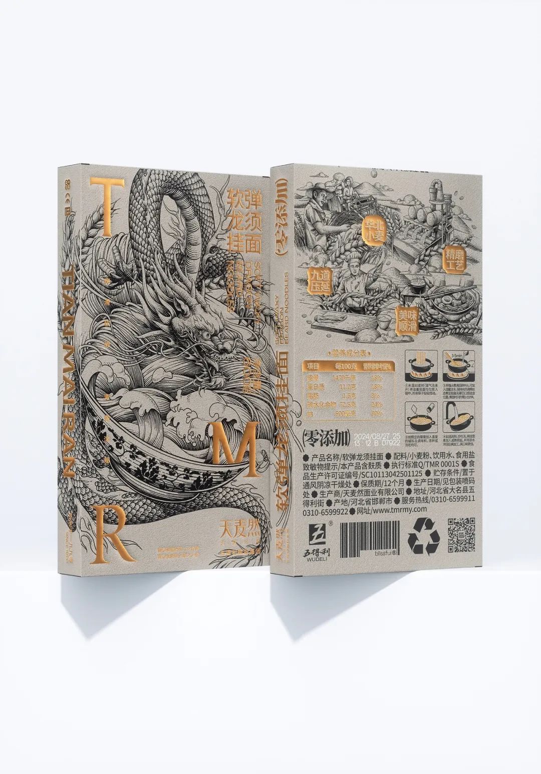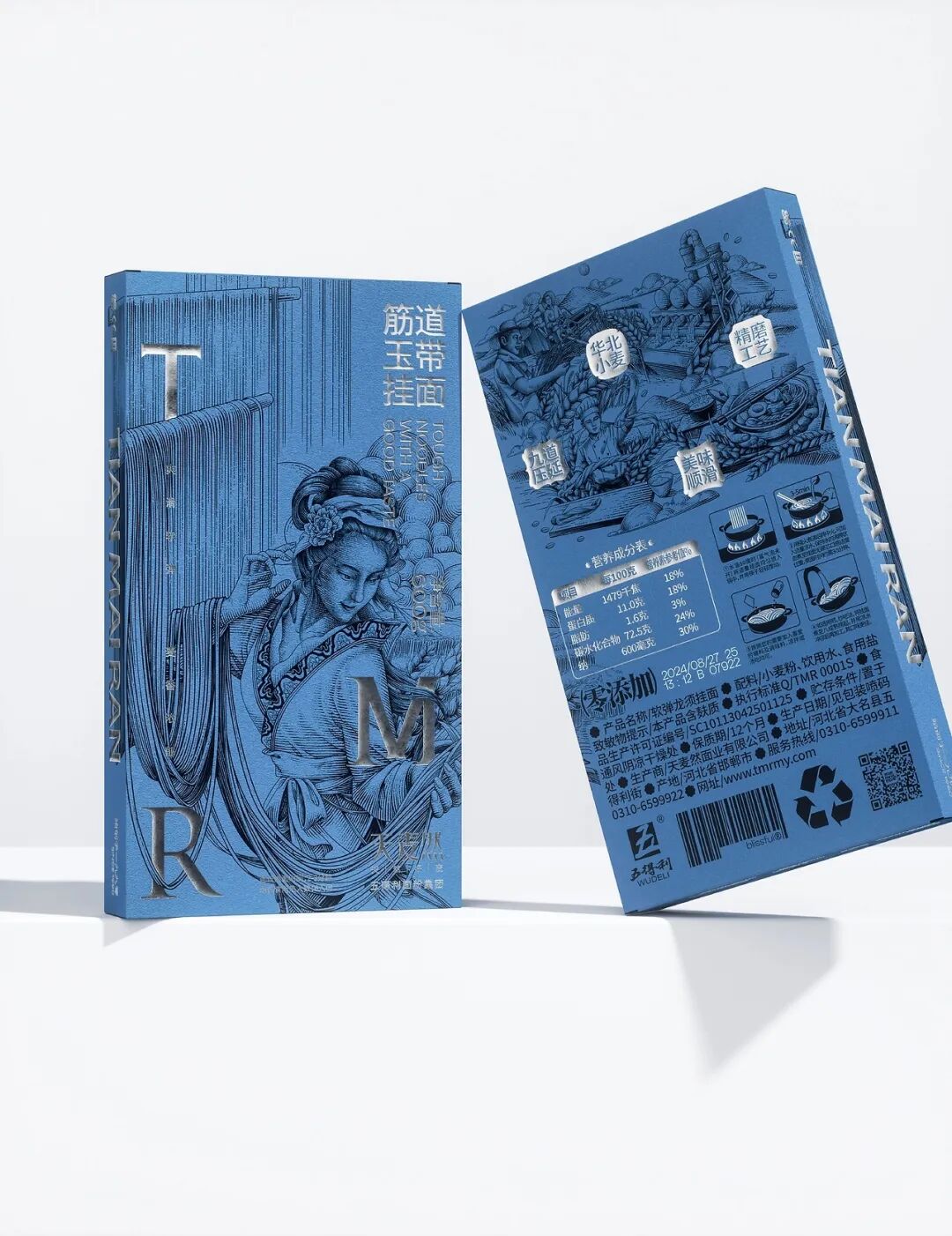 色彩方面,选用低饱和度的中式传统颜色--赭石与藏青色为包装主色调,注入温润、内敛的中国美学文化,契合现代消费者的审美需求,也巧妙将天麦然挂面系列独有的品牌内涵进行完美呈现,再有烫印工艺加持,进一步彰显包装的醒目、独特和高级。