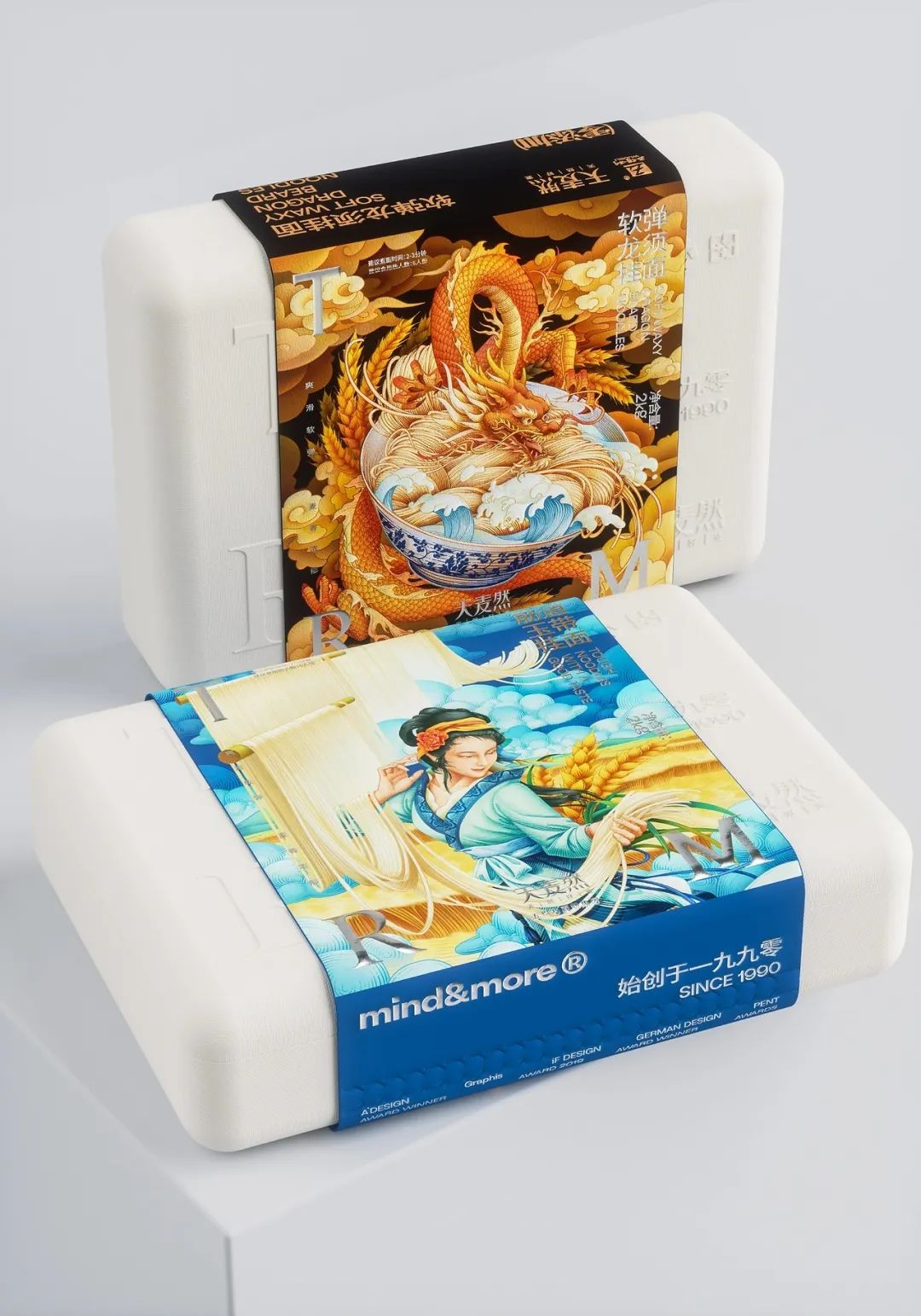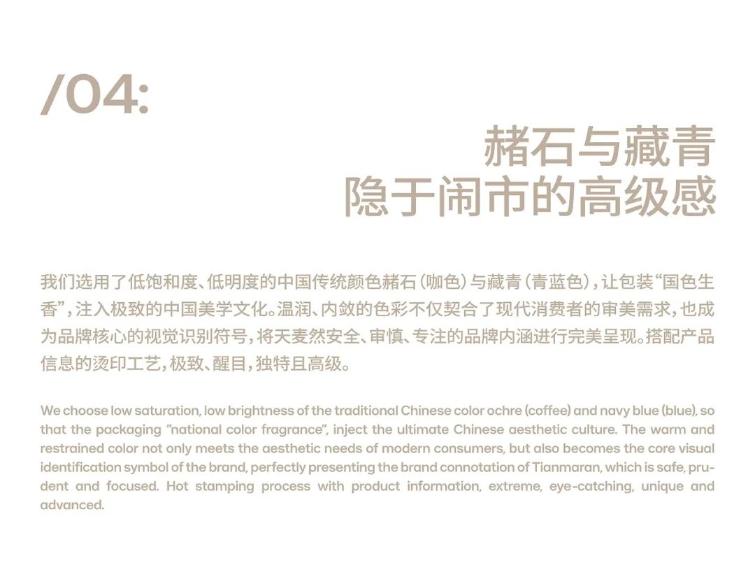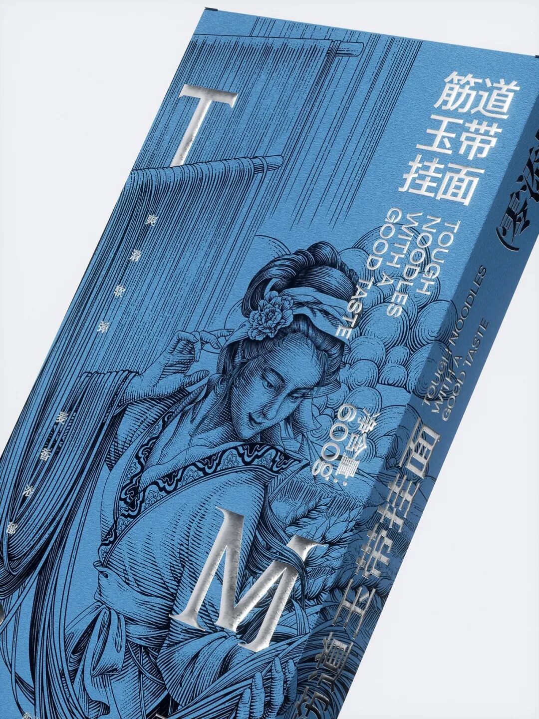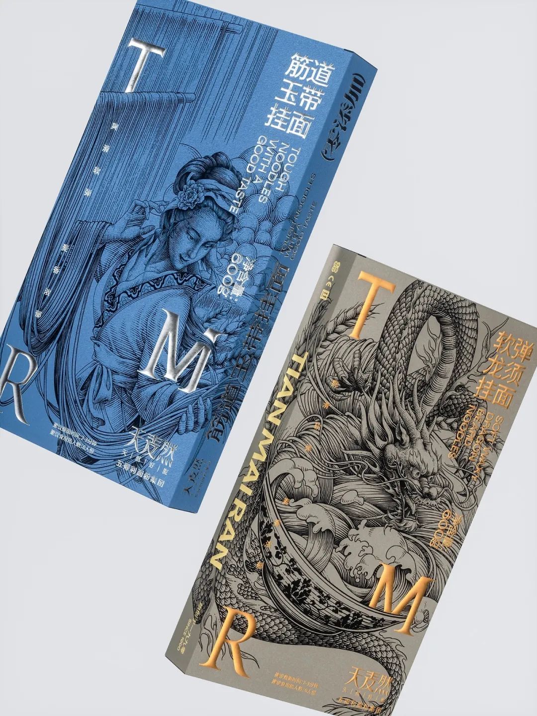 色彩方面,选用低饱和度的中式传统颜色--赭石与藏青色为包装主色调,注入温润、内敛的中国美学文化,契合现代消费者的审美需求,也巧妙将天麦然挂面系列独有的品牌内涵进行完美呈现,再有烫印工艺加持,进一步彰显包装的醒目、独特和高级。