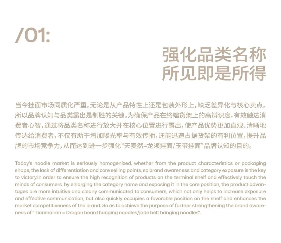 面对当前同质化现象严重的挂面市场,天麦然系列面食想要确保产品在终端货架上的高辨识度,需要找到产品本身的差异化优势与核心卖点--其中在设计上,首先就将品类名称做放大处理,赋能产品优势更直观、清晰地传达给消费者,迅速建立用户对品牌的认知记忆,促进品牌产品的有效传播,提升市场竞争力。