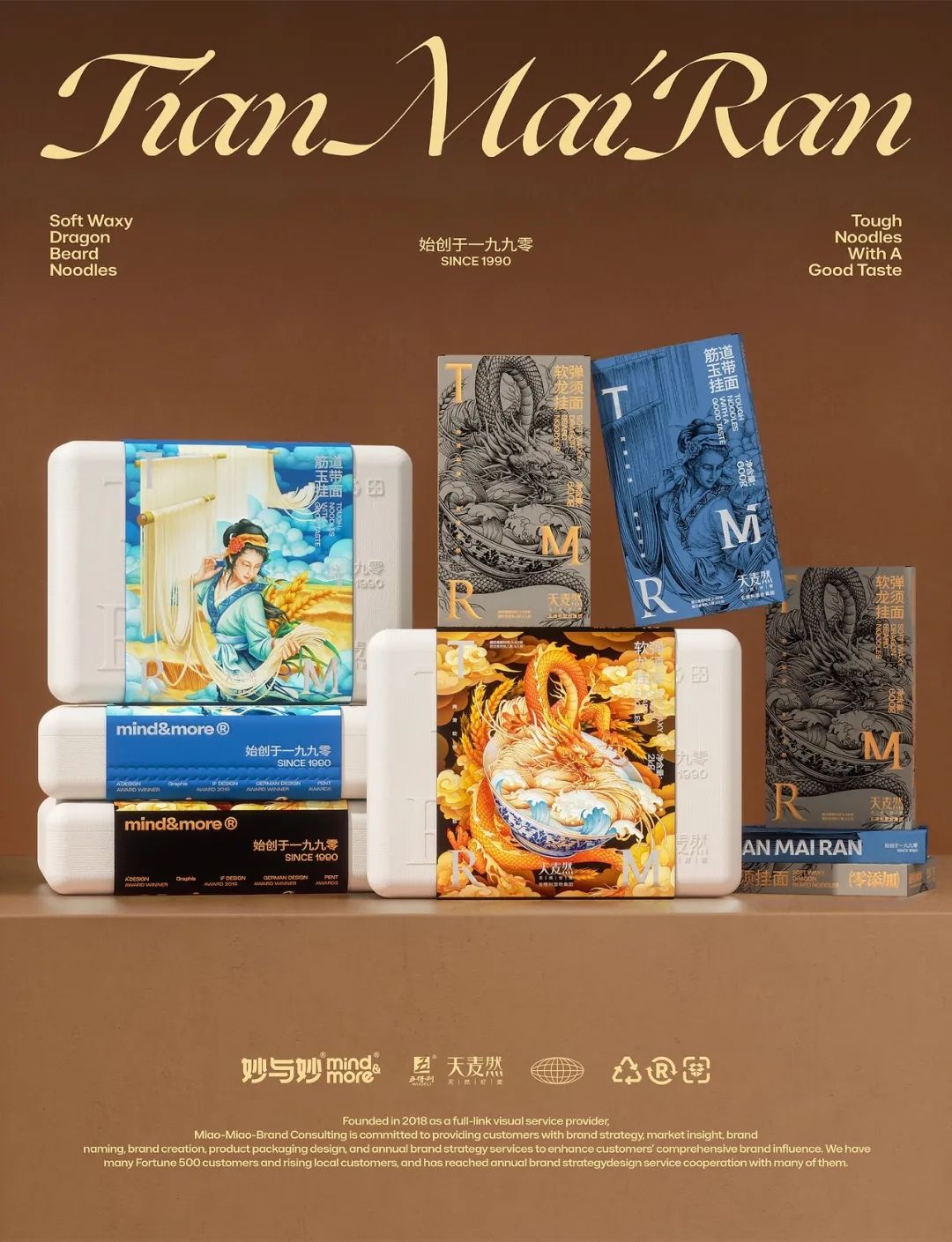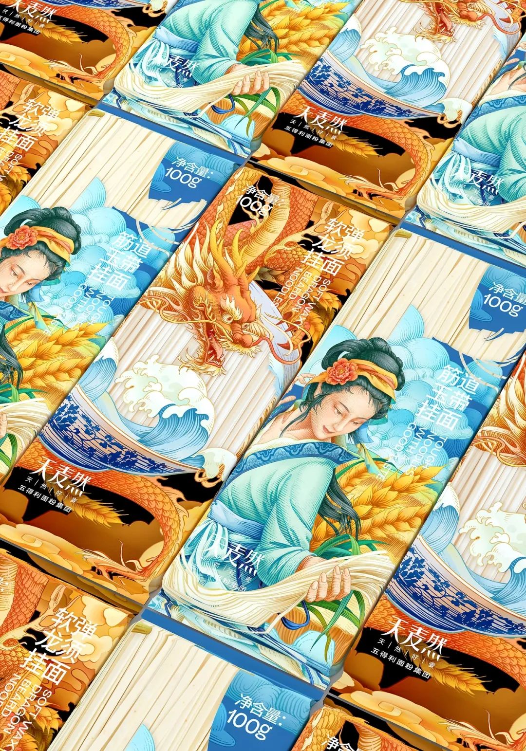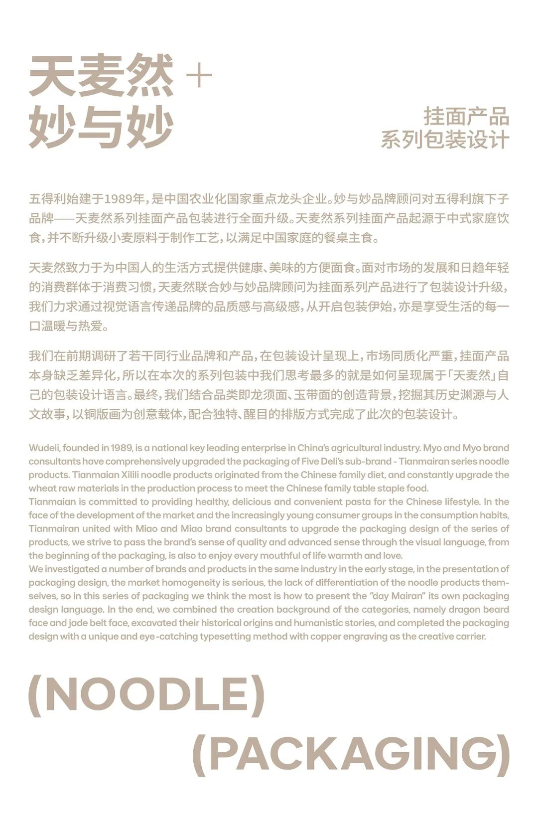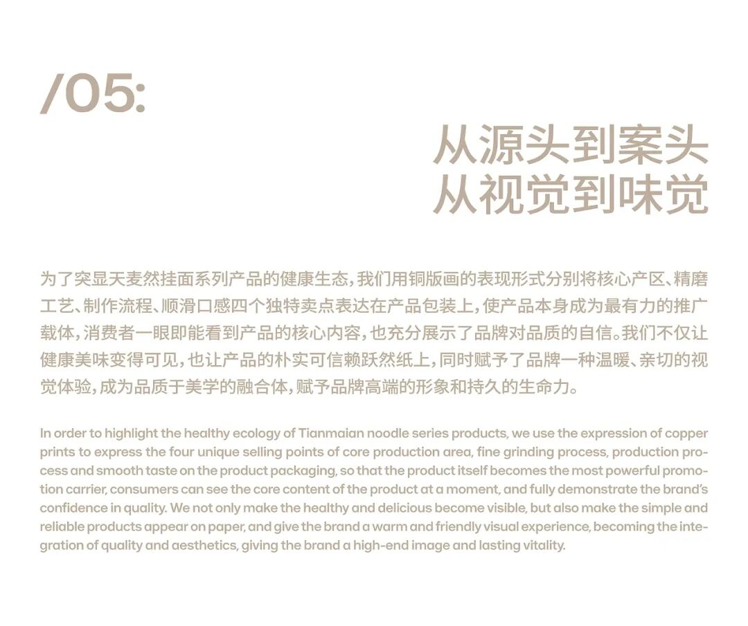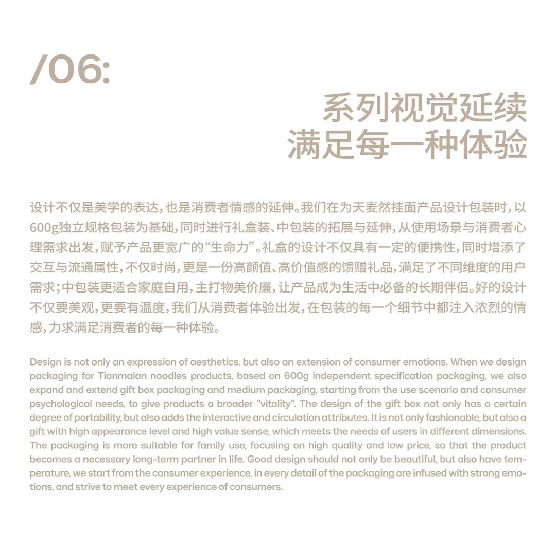 再来看到始建于1989年的五得利品牌,旗下的子品牌天麦然挂面系列起源于中式家庭饮食,并不断升级小麦原料于制作工艺,以满足中国家庭的餐桌主食,此次联合设计团队对该系列面食进行包装升级,希望通过全新的视觉语言传递品牌的高级品质感,享受来自每一口面食的温暖与热爱。