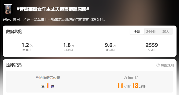 回应一出后,相关话题#撞上劳斯莱斯的货车只有100万保险#迅速登上微博热搜榜首,收获1.2亿阅读量,2.5万讨论量。