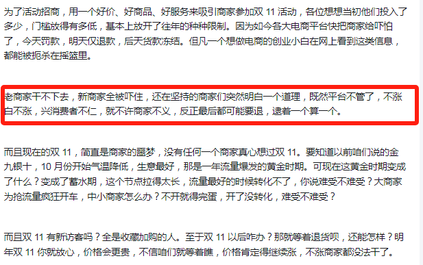 特别是在双11这样的购物节被无限期延长的情况下,原本的低价优势已经不再具有吸引力。