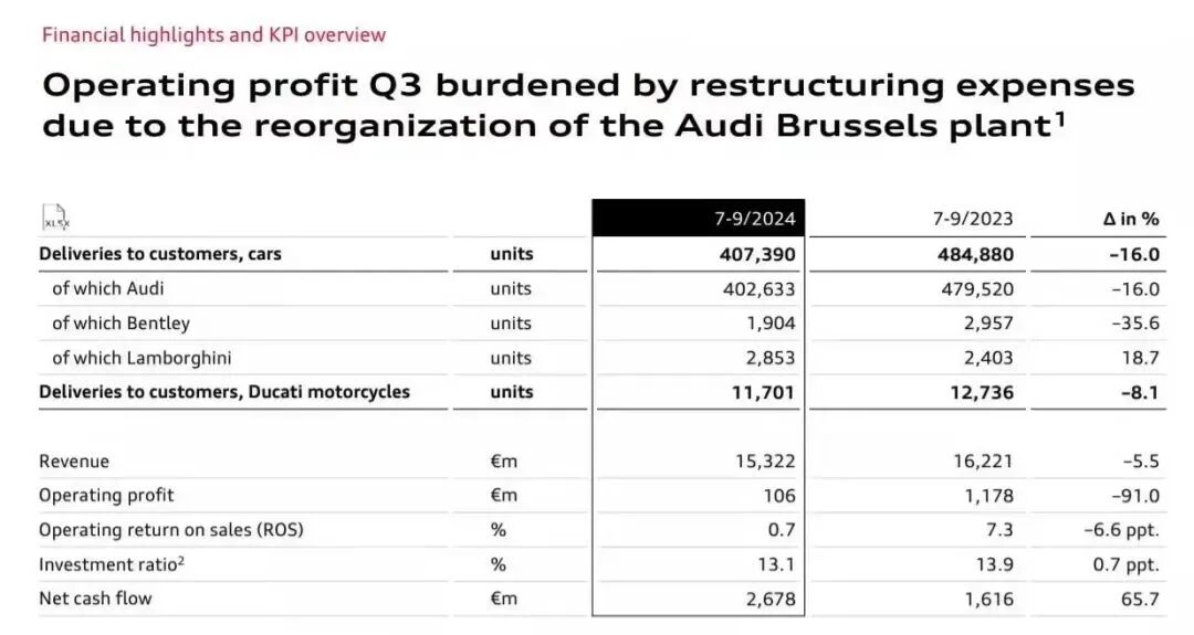 奥迪集团最新财报显示,2024年第三季度,共交付407390辆汽车,同比下降16%。