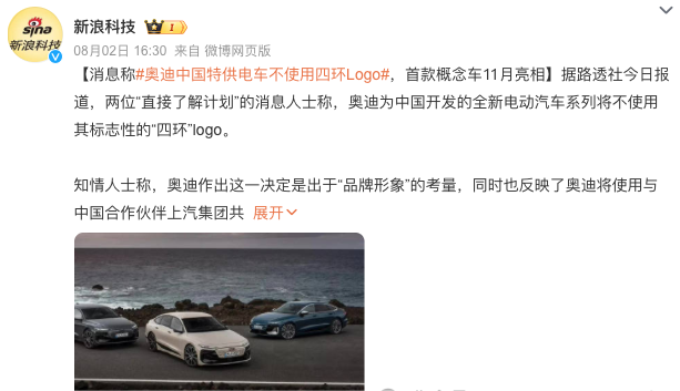 于是奥迪开始变换策略,宣布中国特供电车将摒弃经典四环Logo,首款概念车预计11月亮相。