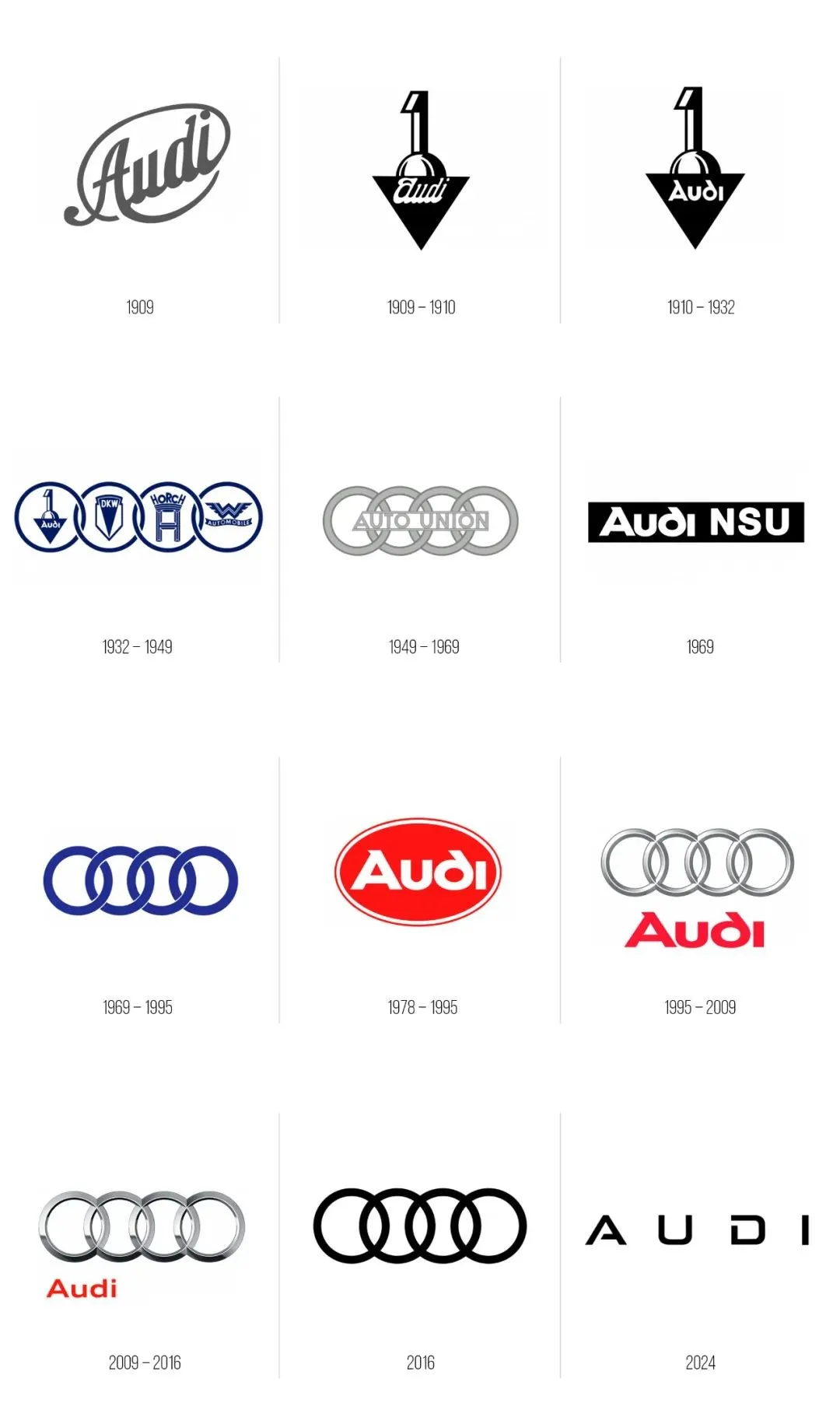 1932年,奥迪与DKW、霍希和漫游者合并后,四环标志才开始出现。