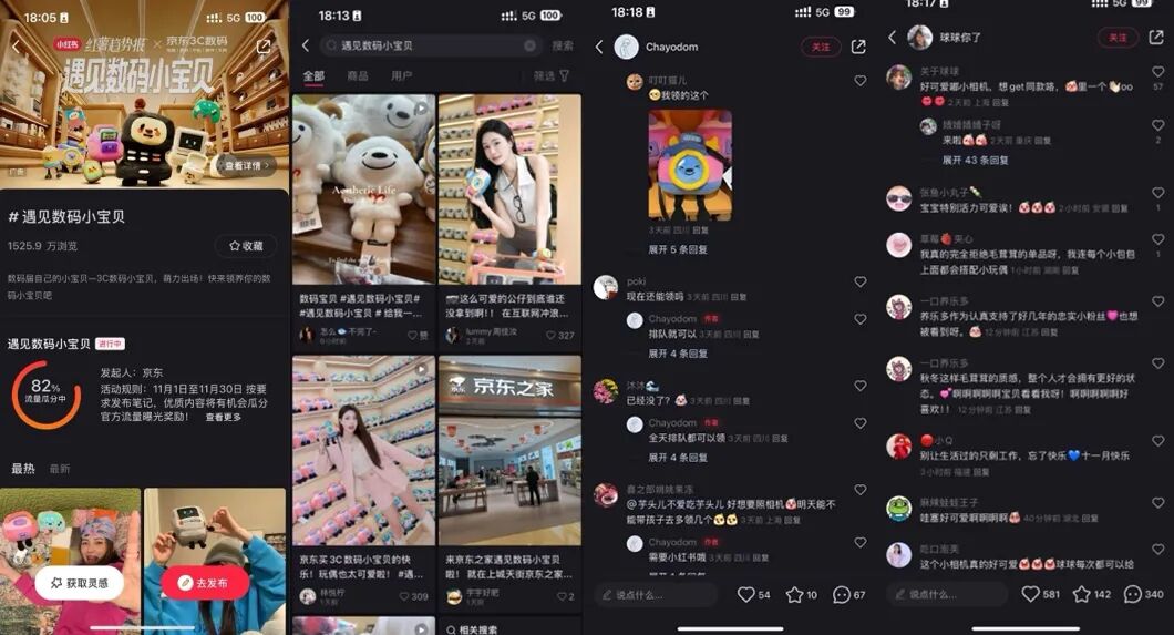 用复古座机拨打电话,装胶卷现场拍照,老键盘写“暴富”程序,喂磁带饼干当场听歌,每款数码小宝贝,都因为“信念感”十足的店员演绎,赢得了用户的笑容和互动。正因如此,#遇见数码小宝贝,也在小红书里迅速刷屏,都让京东3C数码刷足了存在感和好感度。