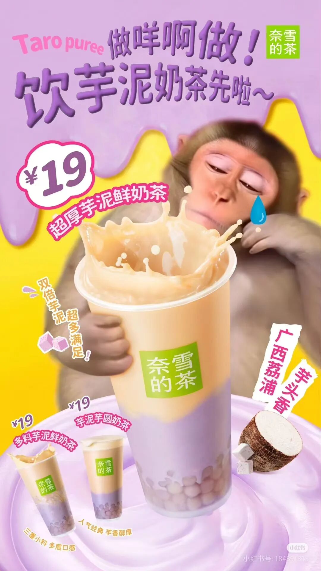为了与打工人共情,联名大师奈雪抓住这波流量,推出吗喽联名奶茶新品。另外还推出了“在打工勿扰”、“做咩啊做”等贴纸周边。
