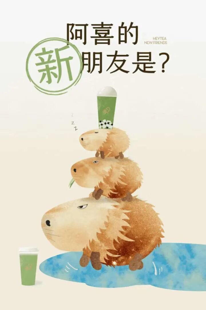 喜茶与南京红山动物园联动,认养了一只脚“杏仁”的水豚,并推出卡皮巴拉杯贴、毛绒贴纸、毛绒杯套等周边产品,将网络热梗化为了具象化产品。