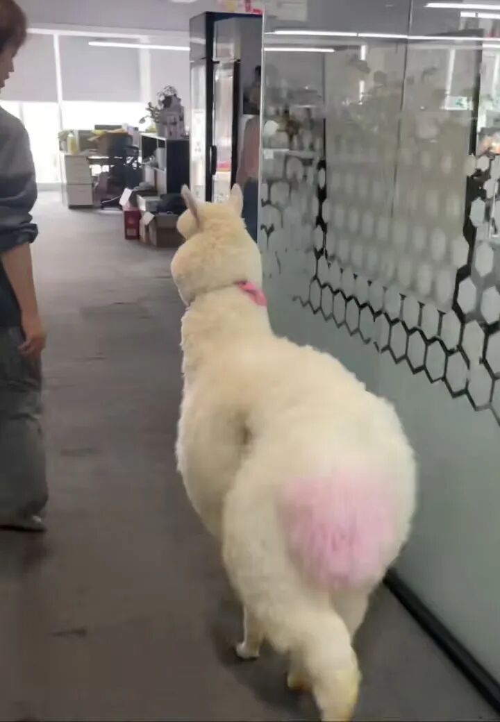 抱着“信你还是信秦始皇”的想法,点开视频看一看。果真有一只羊驼大摇大摆走进公司大门,陪同人员一路毕恭毕敬。