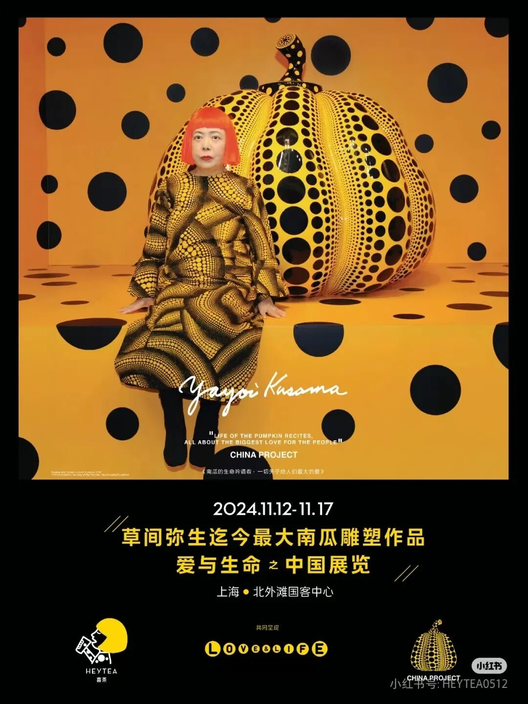 这场展叫《南瓜的生命吟诵着,一切关乎给人们最大的爱》爱与生命之中国展览。主办方除了草间弥生,还有喜茶。
