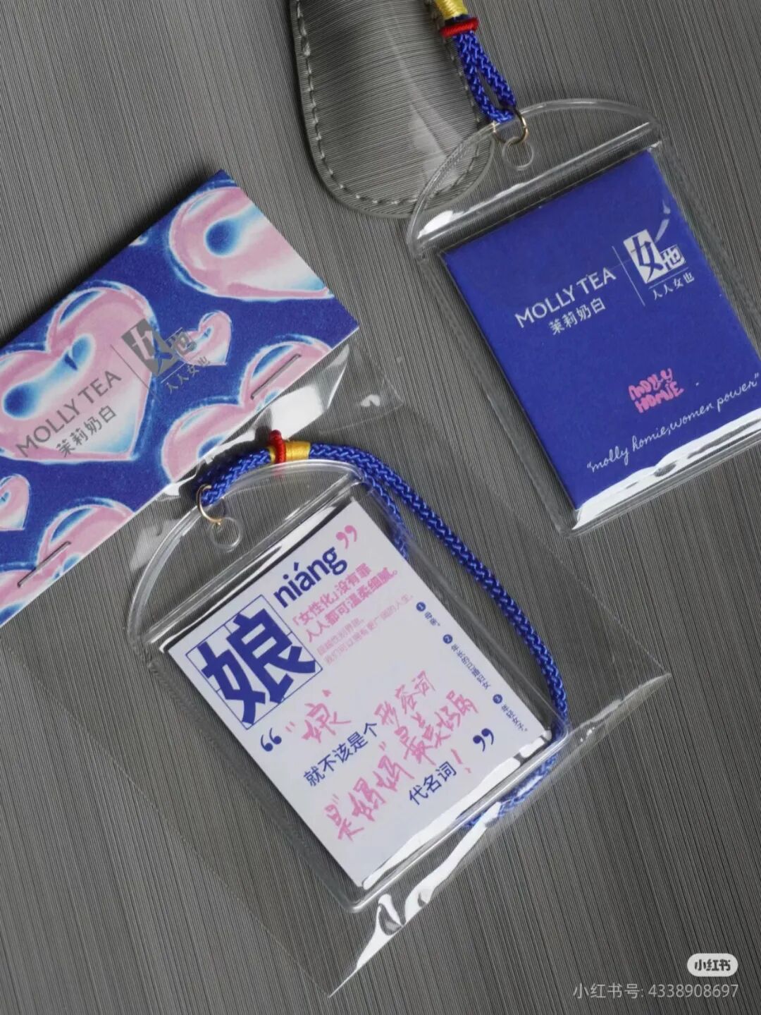茉莉奶白与“从女也”她艺术开展联动,对“妇”、“娘”、“婙”三个字进行了文字新解,抵制女性词汇的污名化,并在浙江、江西门店推出了周边产品。