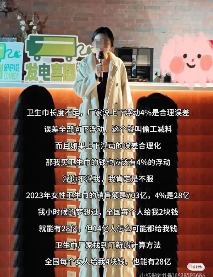 被曝光后,不少卫生巾品牌以“合理误差,不影响使用”的话术开展公关,只短不长的浮动,就像一笔稳赚不赔的买卖,小时候畅想的致富之道,没想到卫生巾替我们实现了。