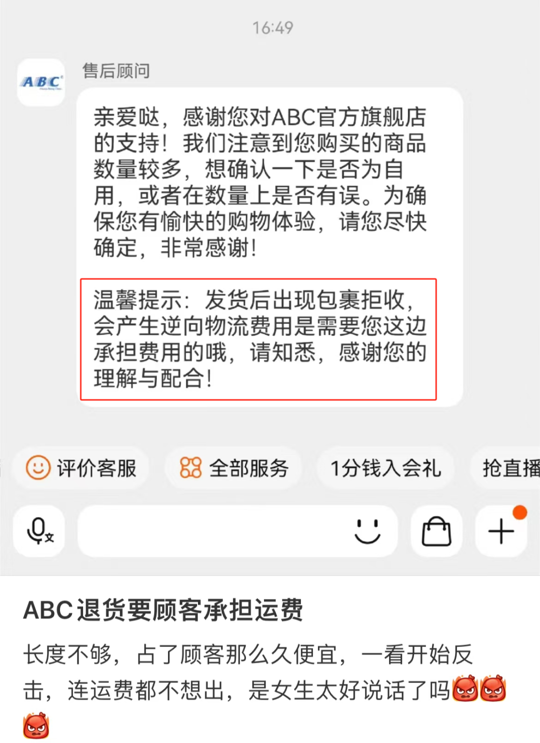 眼瞅着一片混乱,ABC先是推出“恶意退单额外收取运费”的应对举措,好让消费者知难而退。