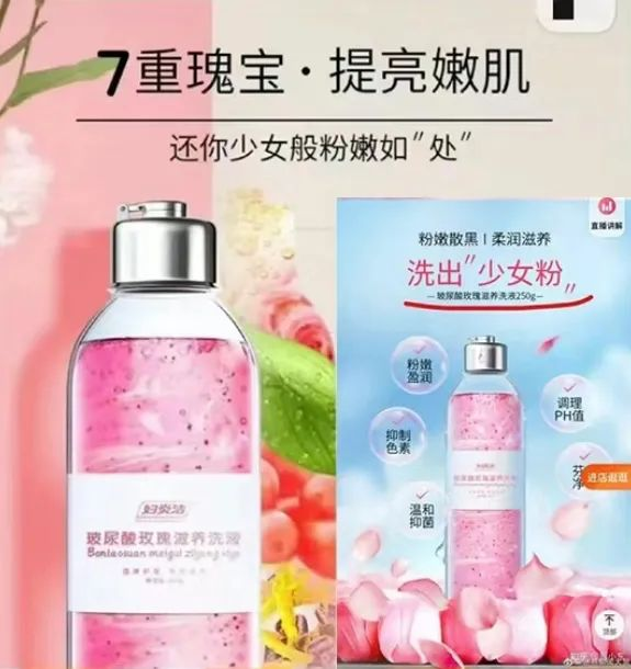 买洗护产品,妇炎洁打出了“太黑太难闻,男人下不去嘴”的宣传语,还在一款阴道洗液的产品说明中直言“洗出‘少女粉’”。
