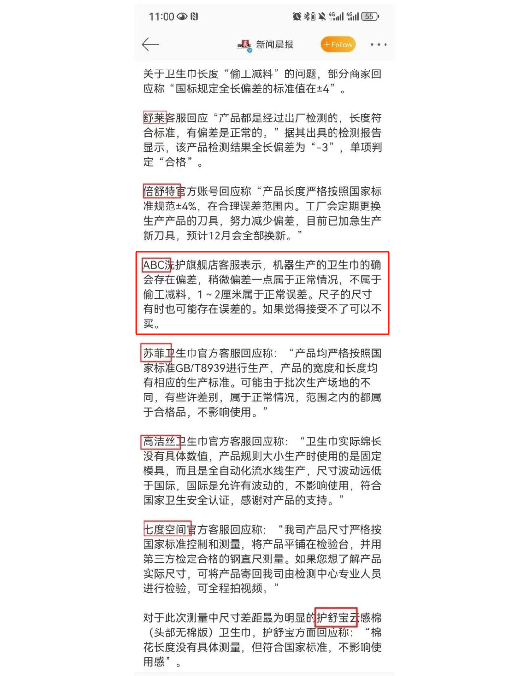 然而,有网友表示ABC并非诚恳道歉,声明里没有正面回应消费者关心的长度造假问题,给出的解决方案也是“即日起启动产品优化升级,逐渐推广到全线产品”。
