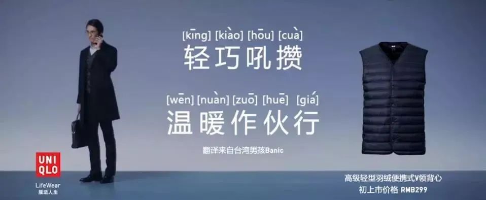 深谙中国各地方言的还有优衣库,用粤语、山东话、上海话、闽南语、重庆话、东北话唱rap宣传产品这件事,实在是酷。