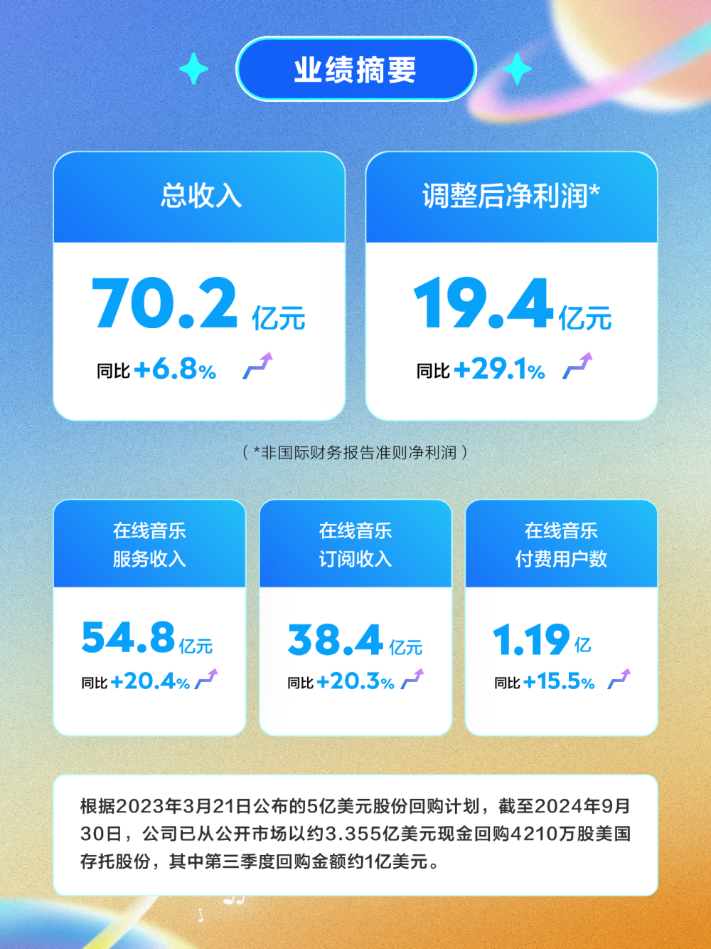 11月12日,腾讯音乐公布2024年第三季度的财务报告。报告显示,该季度公司总收入达到70.2亿元人民币,较去年同期增长6.8%;调整后的净利润为19.4亿元人民币,同比大幅增长29.1%。