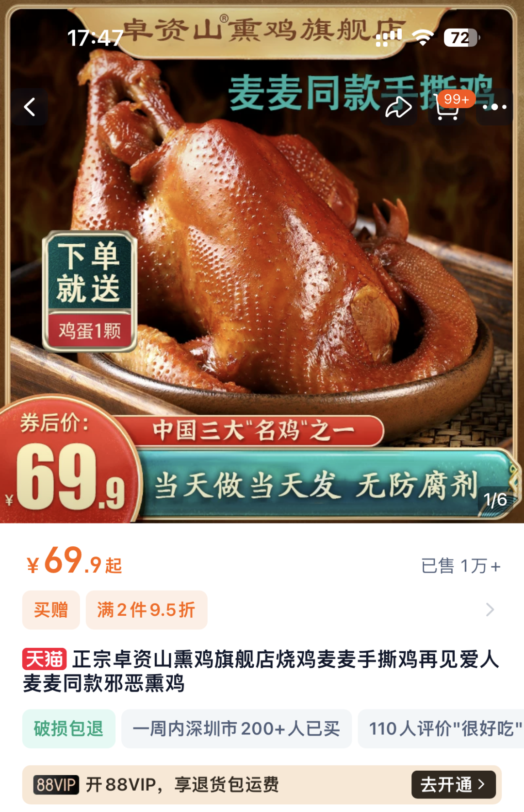 诚然,在天猫卓资山旗舰店在售商品中,可以发现熏鸡的销量明显远高于其他产品,熏鸡商品图上还直接以“麦麦同款”作为宣传语。
