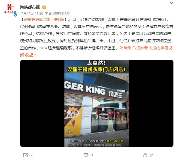 汉堡王的回应比较体面,称这是与当地一家加盟商结束合作导致了门店调整。
