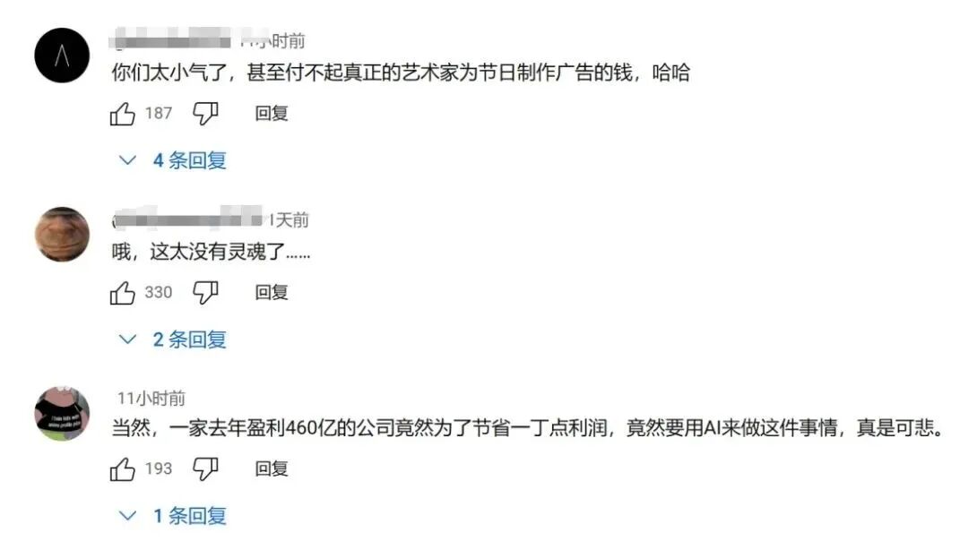 “可口可乐使用人工智能做广告真的让我感到害怕”、“没有灵魂”、“广告毁了圣诞节和整个品牌”……社交平台上,诸如此类的负面评价比比皆是。