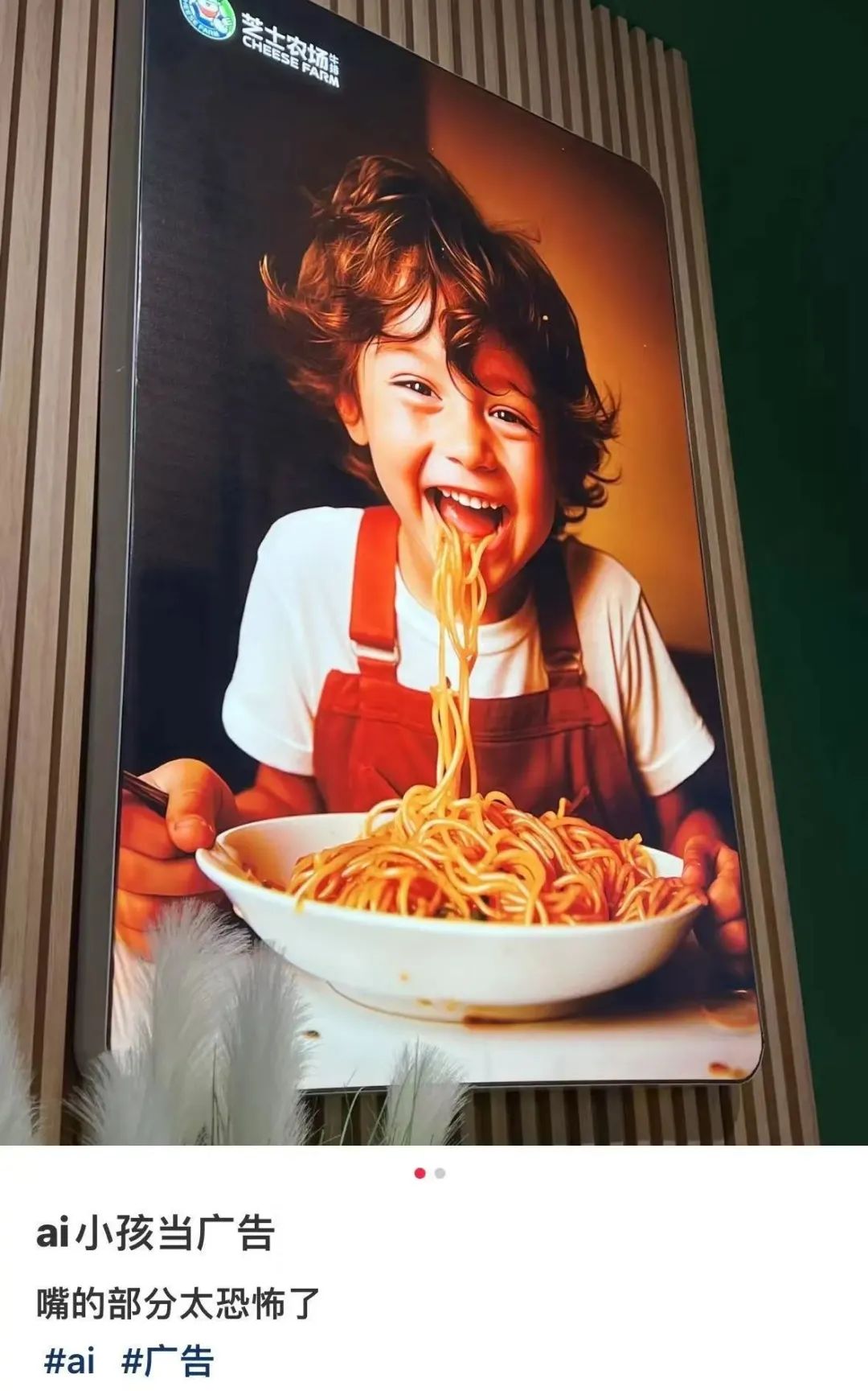 再比如,意面广告中的恐怖小孩,也出自AI手笔。