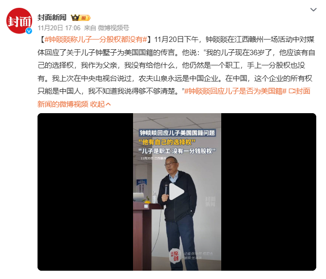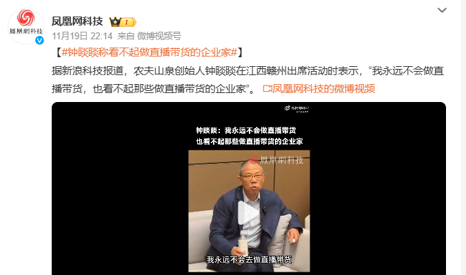 并借由算法的话题进行了回应:“社会的恶是有知识的人产生的,不是底层老百姓......那些天天在骂钟睒睒的人,他不是一个利益所得者,他是一个受害者,他跟钟睒睒是一样的......其实我们现在要的是营商环境,要尊重企业家。”