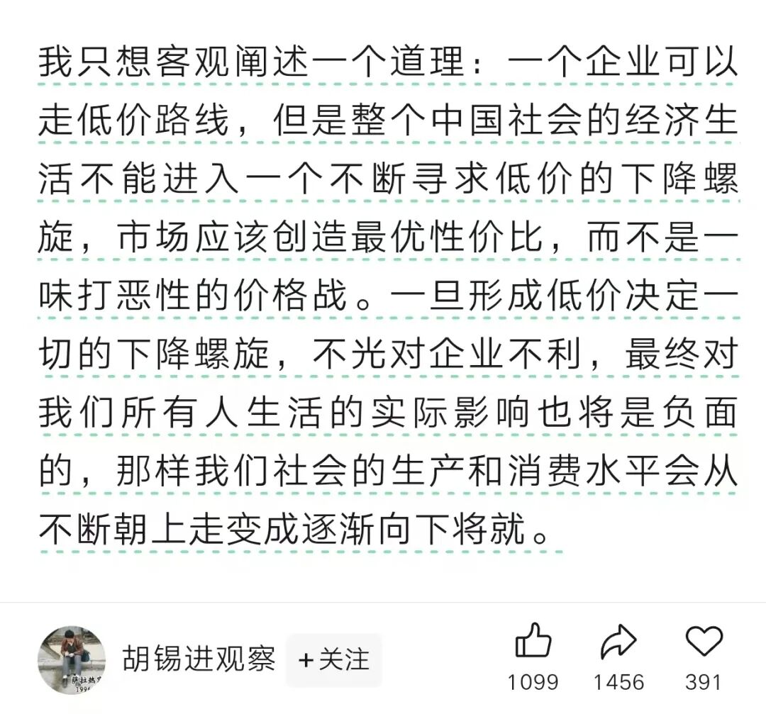 对此,知名大V胡锡进做出了解读:“一旦形成低价决定一切的下降螺旋,不光对企业不利,最终对我们所有人生活的实际影响也将是负面的,那样我们社会的生产和消费水平会从不断朝上走变成逐渐向下将就。”