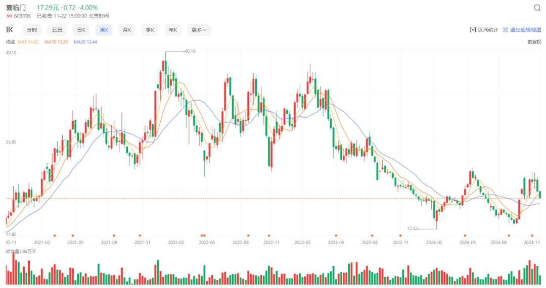 股价表现上,截至11月22日收盘,喜临门(603008.SH)报收17.29元/股,总市值65.53亿元;较2022年1月盘中最高40.1元/股的高点相比,喜临门的股价两年多时间遭遇“腰斩”,总市值蒸发超80亿元。