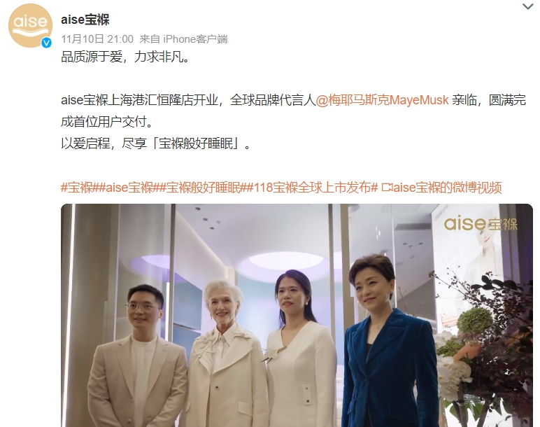 近日,“全球首富”埃隆·马斯克的母亲——梅耶·马斯克不远万里“闪现”上海,出席了一家床品品牌——“aise宝褓”首家线下旗舰店的开幕式。