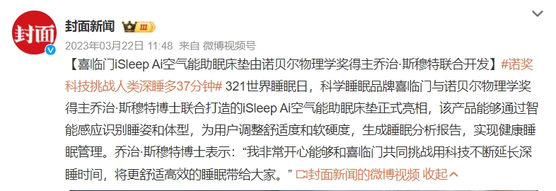 2023年,喜临门又与手诺贝尔物理学奖得主乔治·斯穆特(George F. Smoot)博士合作开发iSleep Ai空气能助眠床垫,号称将“挑战人类延长深睡 37 分钟”。