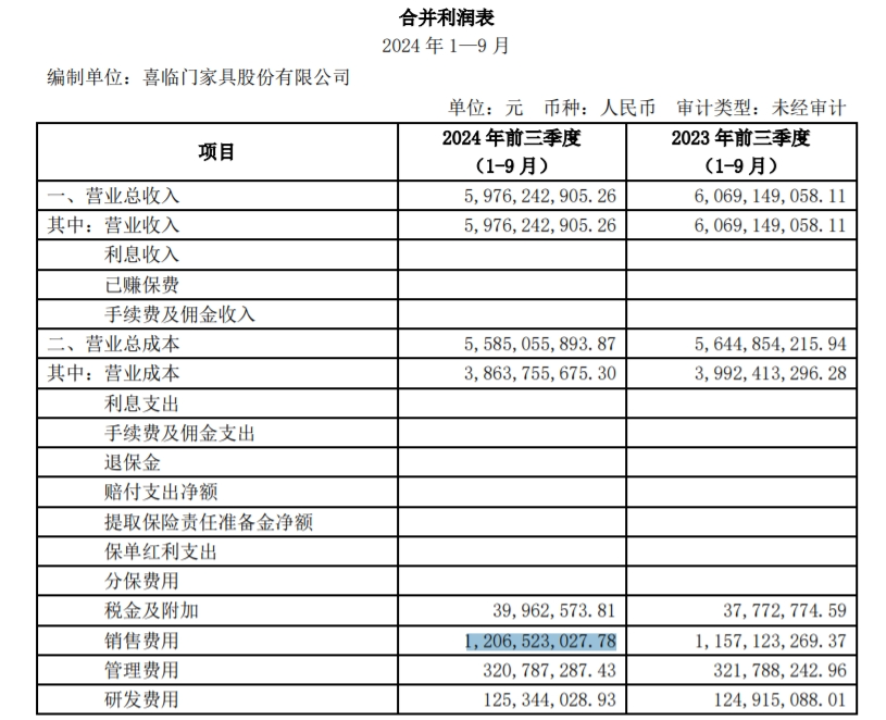 打造高端子品牌,意味着更高的营销投入。由上述品牌活动,就能看到喜临门的财大气粗,而这也反映到喜临门的财报上——2024年前三季度,公司的销售费用高达12.07亿元,同比增长4.27%。但从效果来看,喜临门比去年同期花费了更高的销售费用,取得的营收却没有去年同期高。