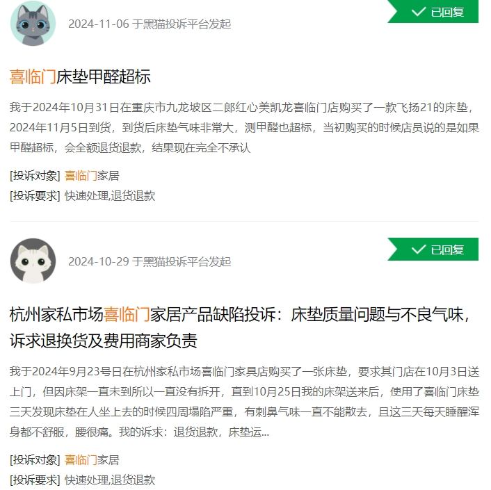 智能化功能更像是锦上添花,保证产品质量和服务才是核心。在“黑猫投诉平台”上,包含搜索词“喜临门”的相关投诉有超过1600条,其中有不少消费者质疑喜临门床垫存在甲醛超标、异味、塌陷等质量问题以及虚假宣传、售后服务等问题。