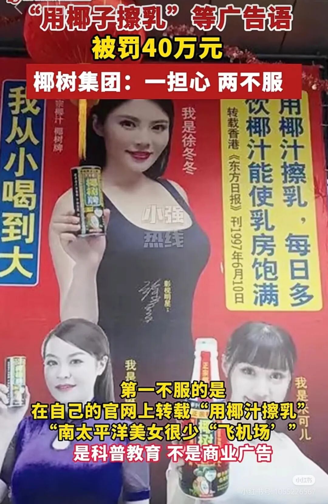 再把时间拉回今年5月,椰树因广告宣传中含“用椰汁擦乳”“南太平洋美女很少‘飞机场’”等,违反《广告法》相关规定被罚40万元。