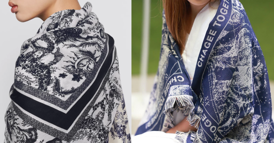 霸王茶姬披肩设计风格与 Dior 的经典Toiles de Jouy 图案非常相似,采用了自然主题元素,如植物、动物和星空等元素设计,强调复古与艺术感。