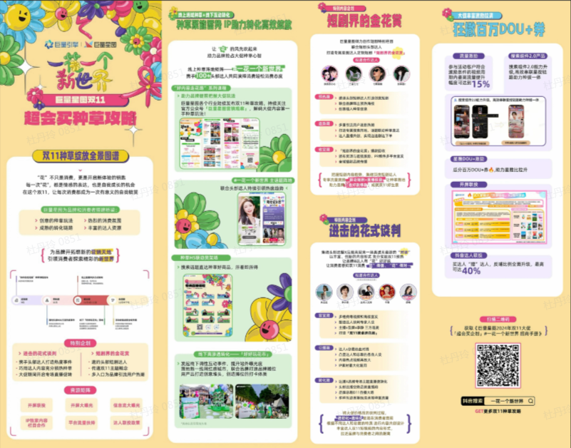 巨量星图双11#一花一个新世界 的案例,最大的特点就是打造节点营销与达人营销的组合拳,利用达人的矩阵共力撬动全民共创内容和热议,从而构建海量人货场匹配的交互场域,最终实现大曝光、强互动、深种草。
