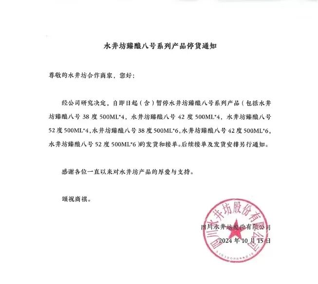 不过在业绩增长的势头之下,水井坊核心产品臻酿八号系列却发布停货的通知,据《水井坊臻酿八号系列产品停货通知》显示,水井坊暂停臻酿八号系列产品(包括水井坊臻酿八号38度、42度、52度等产品)的发货和接单。