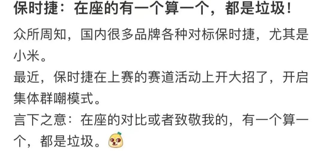 一是,将矛头对准了那些在广告宣传中对标、或者自以为可以击败保时捷的友商,以拉踩之道还治其人之身,狠狠地出一口气。