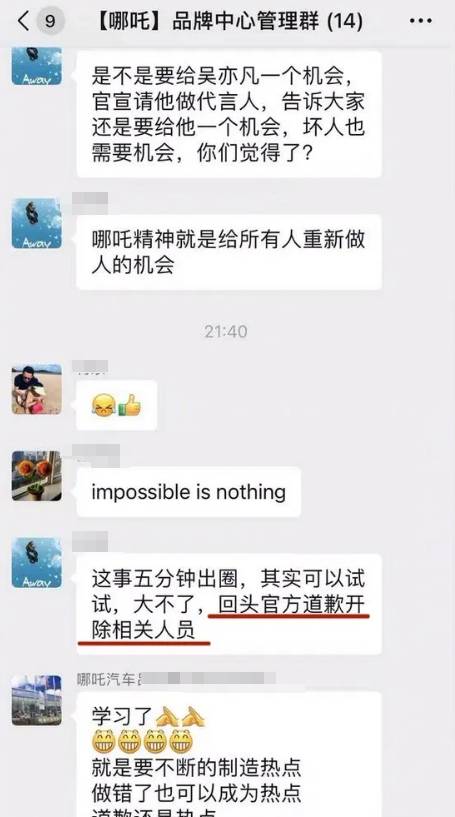 当时有群名为“【哪吒】品牌中心管理群”聊天记录截图在网上流出,哪吒内部居然策划一个五分钟出圈的方案——请吴亦凡代言。