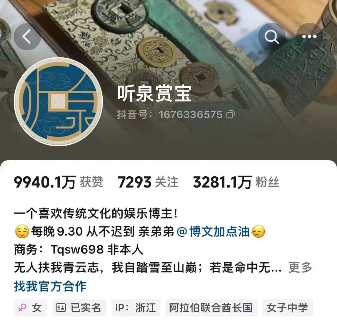 “直播间十万人,三万盗墓的,三万便衣警察,三万同行,剩下一万是观众。”这句话是很多人对“听泉赏宝”的第一印象,也体现了听泉能走红的主要原因。