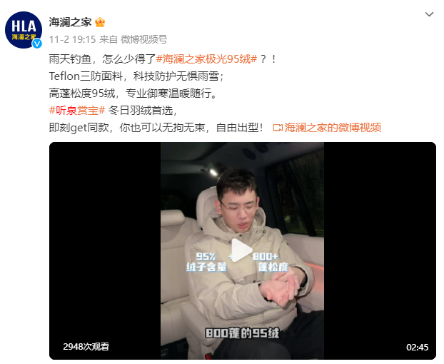 不仅直播间的背景换成了海澜之家,还专门为海澜之家拍了一支外出钓鱼的vlog,宣传新品“海澜之家极光95绒”不仅保暖,而且帅气。