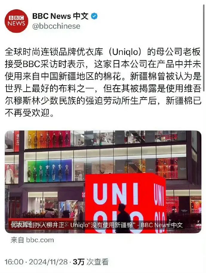 近日,优衣库创始人“柳井正”在接受BBC采访时,再次提及新疆棉,并态度明确地表示,优衣库不使用来自中国新疆地区的棉花。