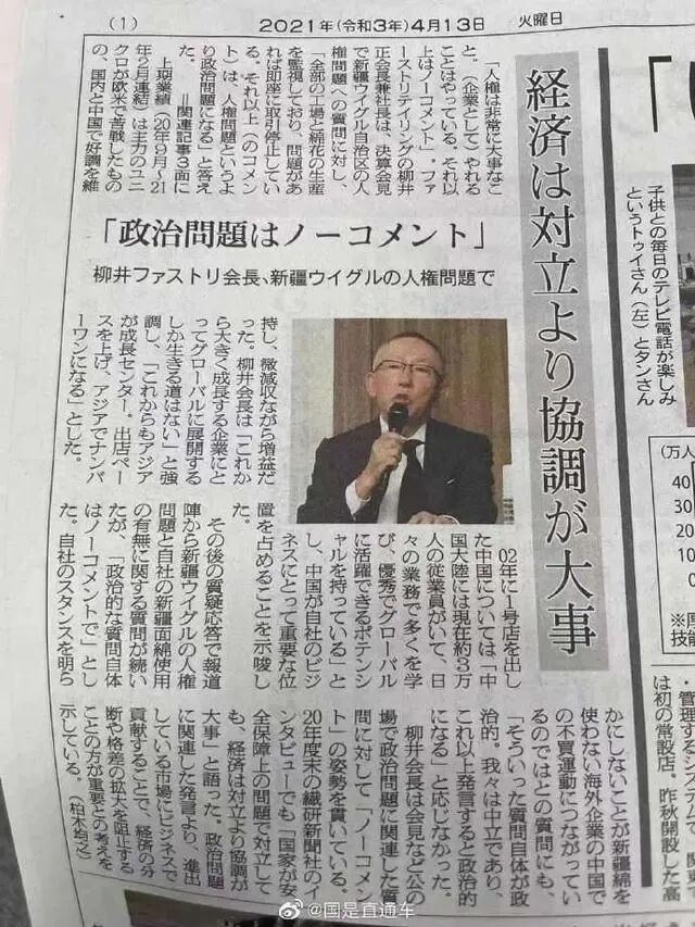 2021年4月,在迅销集团(优衣库母公司)业绩发布会上,面对记者相关提问,柳井正的回答非常“理中客”,称“该问题本身带有政治色彩,我们保持中立态度”,还说“人权是非常重要的事情,作为企业我们正在做我们能做的事情,对于其他事情不予置评”。