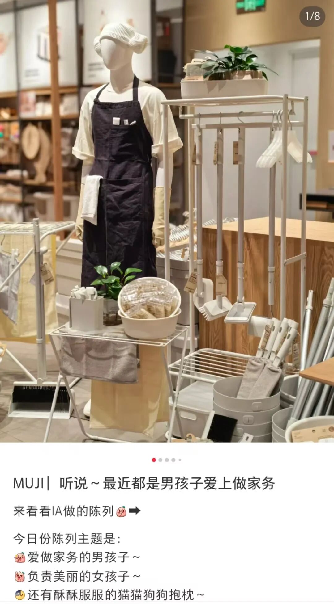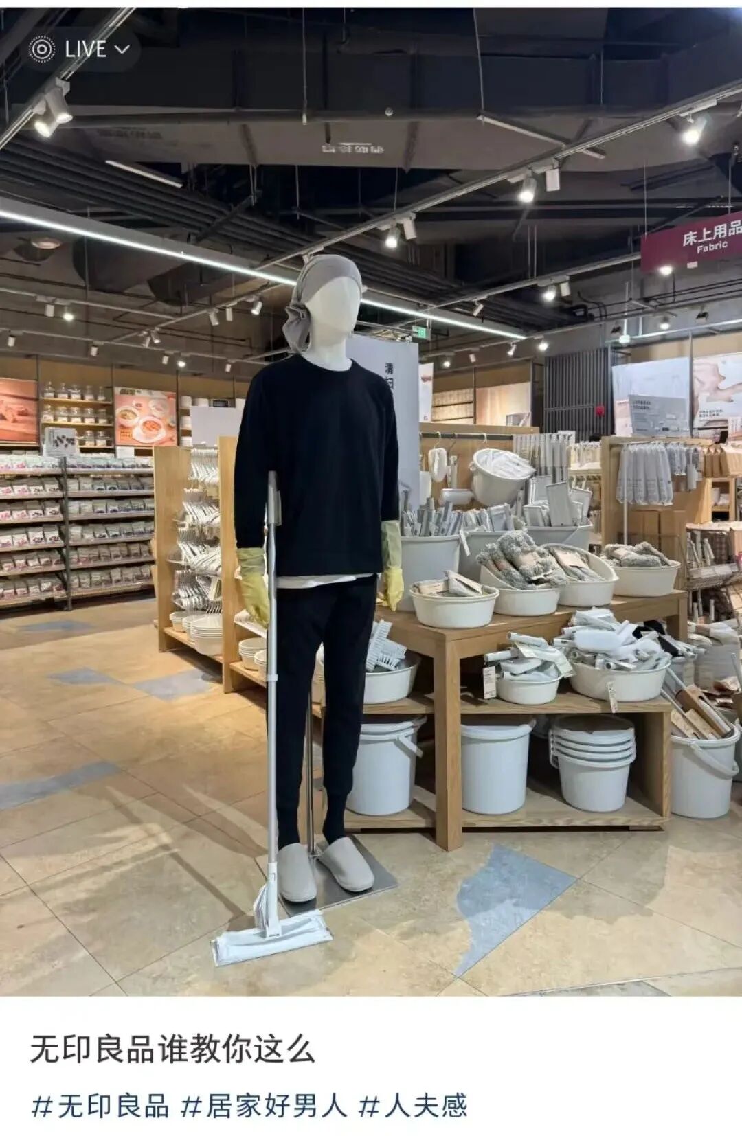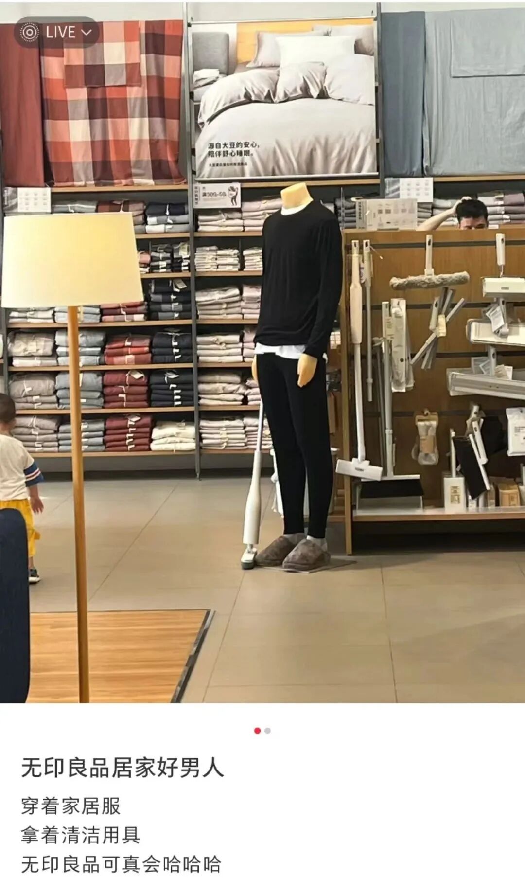 有网友在逛无印良品的时候被逗笑了。她发现男模特身穿居家服,手里拿着一把扫帚。